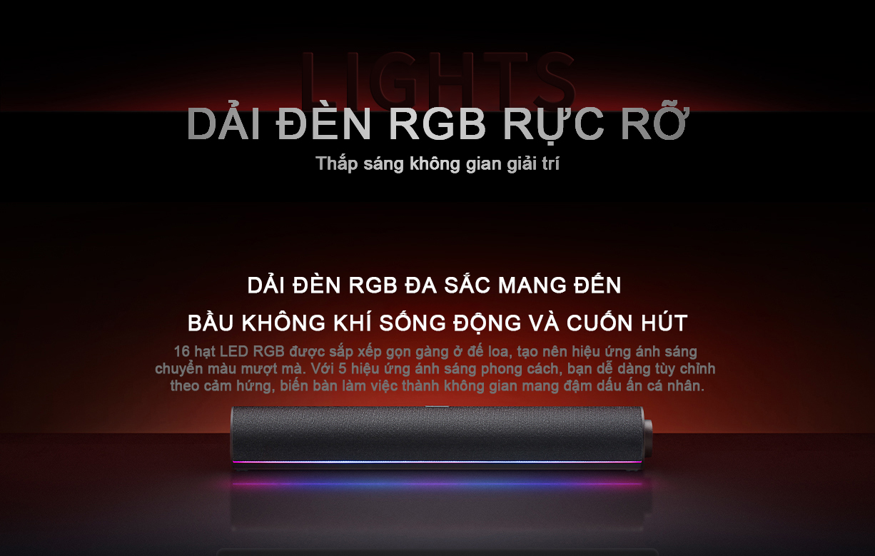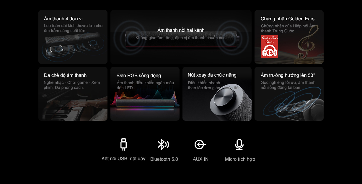 & Free ShippingBốn đơn vị âm thanh nổi | Chứng nhận chất lượng âm thanh “Tai Vàng” | Đèn RGB tạo không khí | Hiệu ứng âm thanh đa tình huống | Kết nối USB một dây | Kiến trúc âm trường bầu trời 53°